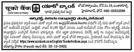 Tender for Interior Furnishing, Electrical, Wire & LAN Cabling and Air conditioning works in various UCO Bank branches under Andhra Pradesh and Telangana.