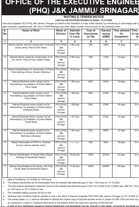 Tender for internal electrical works carried out for Remodeling/Up gradation of Police Station Rehmbal Udhampur