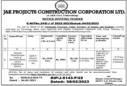Tender for Internal Electrification work of Electrical Block, GCET Chak Balwal Jammu.