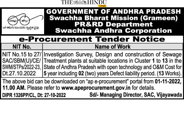 Tender for Investigation Survey, Design and construction of Sewage Treatment plants at suitable locations in Cluster 1 to 13 in the State of Andhra Pradesh with open technology and O&M Cost for 5 year including 02 (two) years Defect liability period. (13 Works).
