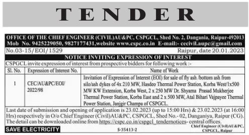 Tender for Invitation of Expression of Interest (EOI) for sale of fly ash /bottom ash from silo/ash dykes of 4x 210 MW, Hasdeo Thermal Power Station, Korba West/1×500 MW KW Extension, Korba West, 2 x 250 MW Dr. Shyama Prasad Mukherjee Thermal Power Station, Korba East and 2 x 500 MW, Atal Bihari Vajpayee Thermal Power Station, Janjgir Champa of CSPGCL.