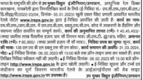 Tender for invited by Indian Railways portal www.ireps.gov.in based on a packet system for digging Name of work M.C.F. R. L in B.L. H.B. M.W.S. C.N. The entire work of wiring including handling and installation of equipments in the coach. Estimated cost of the work