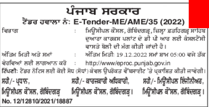 Tender for invited for Consultancy for DPR of Corks Plant by Municipal Council, Gobindgarh, District Fatehgarh Sahib.