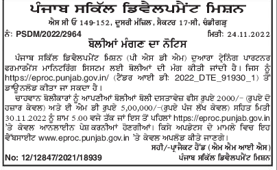 Tender for invited for Training Partner Performance Monitoring System by Punjab Skill Development Mission (PSDM).