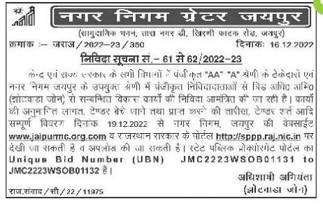 Tender for invited from the registered AA A category contractors of all departments of Central and State Government and registered tenderers of Municipal Corporation Jaipur in appropriate category for development works related to Lid Adhi (Jholwada zone)