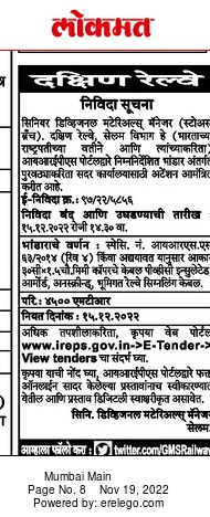 Tender For invites the attention of the said office for supply under the under-mentioned stores through IREPS portal.||Copper only PVC insulated conductor, unscreened, underground railway signaling cable. Pari 4500 Mtr