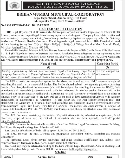 Tender for Inviting expression of interest from renowned Legal Firm having Expertise in Till the completion company Law matters in Respect of Seven Hills Healthcare Hospital Pvt. Ltd. WS of the matter B.M.C. About Seven Hills Hospital (Public Private Partnership Project) of BMC The EOI is invited in two packet system for the above mentioned service. BMC reserves its right of awarding the work to the successful bidder
