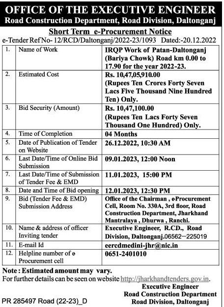 e-Tender Ref No-12/RCD/Daltonganj/2022-23/1093 Dated:-20.12.2022