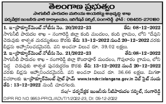Tender for IRRIGATION DEPARTMENT – DATE FOR PERMANENT REPAIRS OF “DEVUNI CHERUVU” IN KANDI MANDL, KANDI VILLAGE, SANGAREDDY DISTRICT