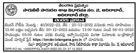 Tender for IRRIGATION DEPARTMENT SECTION of works in Adilabad, Adilabad District.