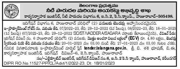 Tender for Irrigation Division NO. 6 For (2) works under Huzurabad,