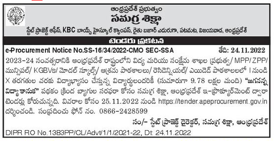 Tender for “Jagananna Vidya Kanuka” Scheme for all the students studying up to Class X for supply of bags