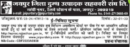 Tender for Jaipur District Milk Producers Cooperative Union Ltd. Gandhi Nagar, Near Railway Station, Jaipur 302015 email: jaipurdairy@jaipurdairy.com