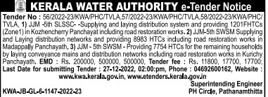 Tender for JJM -5th SLSSC–Supplying and laying distribution system and providing 1201FHTCs (Zone1) in Kozhencherry Panchayat including road restoration works.