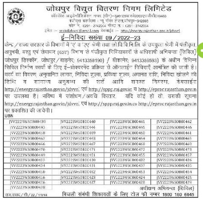 Tender for Jodhpur Vidyut Vitran Nigam Limited A’ category in State Government Departments and which Viveni.Ltd. registered in the appropriate category of Online tenders are invited through e-procurenet process for various loose construction works under the Executive Engineer (Civil) Jodhpur DISCOR, Jodhpur / Barmer 9413359190)