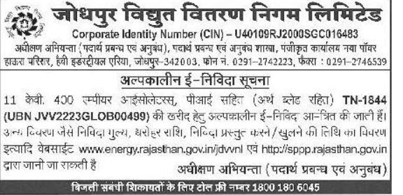 Tender for Jodhpur Vidyut Vitran Nigam Limited Corporate Identity Number (CIN) U40109RJ2000SGC016483 – Superintending Engineer (Materials Management & Contracts), Materials Management & Contracts Branch, Registered Office New Power Hakra Parisar Heavy Industrial Area, Jodhpur