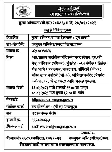 Tender for Kandivali Fire Station in R/South Ward, S. V. Road, Kandivali (West), Mumbai 400067 Structural and General Repairs to 1 Diesel Shed and 2 Pump Rooms, Fire Bye, Dormitory (G+2) including Staff Quarters (G+3), Officers Quarters (Basement + GR +2) .