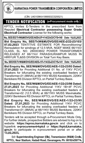 Bid Enquiry No. SEE/Tr(W&M)/DVG/EE/AEE-2/22-23/103/