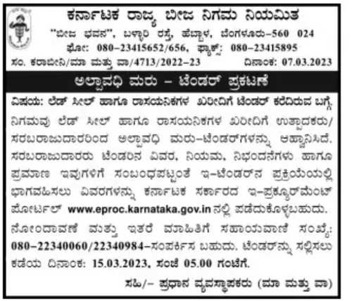 Subject: Regarding the invitation of tender for purchase of lead seal and chemicals. The Corporation has invited short-term re-tenders from manufacturers/suppliers for purchase of lead seal and chemicals. Suppliers can get the details regarding tender details, terms and conditions and quantity to participate in the process of e-tender from Karnataka Government’s e-procurement portal