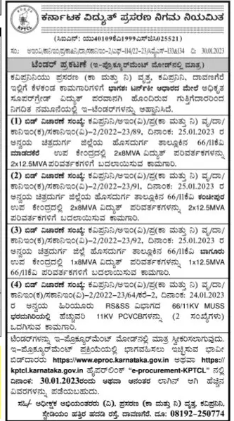 Tender for Kavipranini/AIM(V)/P(Ka&Ni) Vri/Da BORO(S)/ ANDRO()-2/2022-23/89, Do: 25.01.2023 of Hosadurga Taluk, Chitradurga District Work of changing 2x8MVA transformers to 2×12.5MVA transformers in substation without making 66/11 KV,