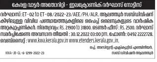 Tender for Kerala Water Authority – Electronic Darghas Notice Darghas: ET-02 to ET-08/2022 23/AEE (PH ALR. Annual maintenance of pipelines in various Panchayats under Alathur Subdivision