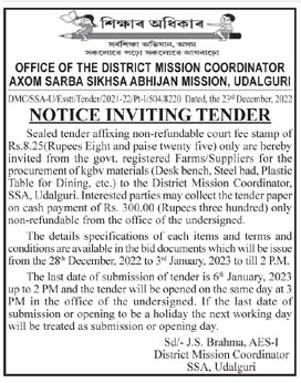 Tender for kg bv materials (Desk bench, Steel bad, Plastic Table for Dining, etc.) to the District Mission Coordinator, SSA, Udalguri.