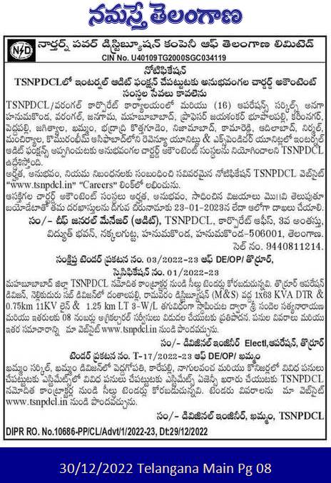 Tender for Khammam Various works at Peddagopati, Karepalli, Nagulavancha and Konizar in Khammam Circle, Khammam Division Sealed tenders are invited from TSNPDCL