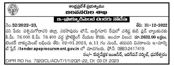 Tender for Km to Vasishta Right Flood Bank at Buddigavani Dock, Narasapuram Town, West Godavari District.