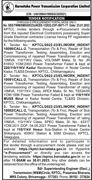 Tender for KPTCL/2022-23/EL/WORK_INDENT 10090/CALL-2, Transportation (To & Fro), Repair of Sick Power Transformer, Testing, Assembling, Erection and Commissioning of repaired Power Transformer of rating 10MVA, 110/11KV Class, VOLTAMP Make, Sl. No: JN 8165/2 YOM:2003 Power Transformer Failed & kept at 220/110/11KV Kadur Receiving Station in Nodal Centre Kadur, TL&SS Division, KPTCL, Chikkamagaluru.