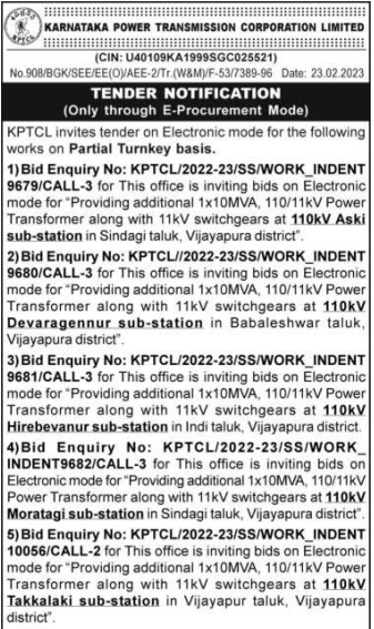 Tender for KPTCL/2022-23/SS/WORK_INDENT 9679/CALL-3 for This office is inviting bids on Electronic mode for Providing additional 1x10MVA, 110/11kV Power Transformer along with 11KV switchgears at 110kV Aski sub-station in Sindagi taluk, Vijayapura district.