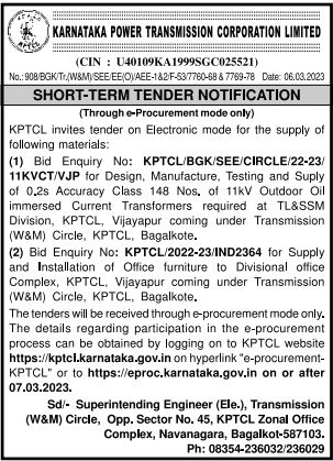 Tender for KPTCL/BGK/SEE/CIRCLE/22-23/ 11KVCT/VJP for Design, Manufacture, Testing and Suply of 0.2s Accuracy Class 148 Nos. of 11kV Outdoor Oil immersed Current Transformers required at TL&SSM Division, KPTCL, Vijayapur coming under Transmission (W&M) Circle, KPTCL, Bagalkote.