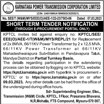 Tender for KPTCL/SEE/ EEE(O)/AEE-1/T(W&M)/MYS/REPL/21 for Replacement of 2x 8MVA, 66/11KV Power Transformer by 2 x 12.5 MVA, 66/11KV Power Transformer at 66/11KV Mahadeshwarapura Sub-Station in Pandavapura Taluk, Mandya District on Partial Turnkey Basis.