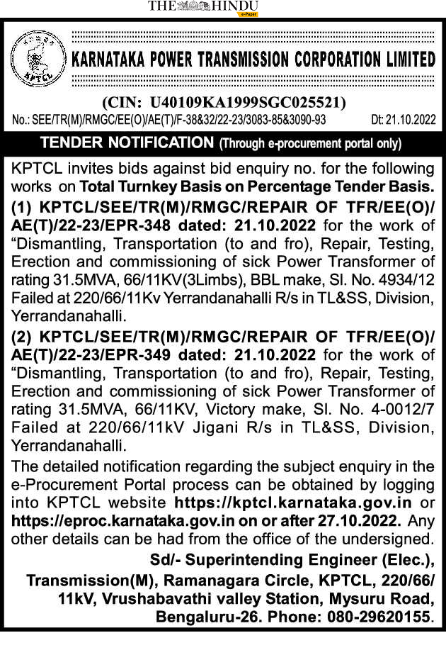 KPTCL/SEE/TR(M)/RMGC/REPAIR OF TFR/EE(O)/ AE(T)/22-23/EPR-349 dated: 21.10.2022 for the work of “Dismantling, Transportation (to and fro), Repair, Testing, Erection and commissioning of sick Power Transformer of rating 31.5MVA, 66/11KV, Victory make, Sl. No. 4-0012/7 Failed at 220/66/11kV Jigani R/s in TL&SS, Division, Yerrandanahalli.