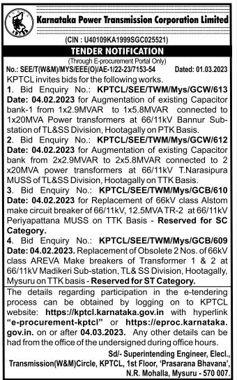 Tender for KPTCL/SEE/TWM/Mys/GCB/610 Date: 04.02.2023 for Replacement of 66kV class Alstom make circuit breaker of 66/11kV, 12.5MVA TR-2 at 66/11kV Periyapattana MUSS on TTK Basis – Reserved for SC Category.
