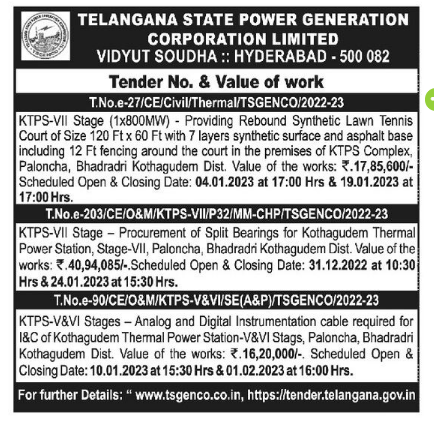Tender for KTPS-V&VI Stages – Analog and Digital Instrumentation cable required for I&C of Kothagudem Thermal Power Station-V&VI Stags, Paloncha, Bhadradri Kothagudem Dist.