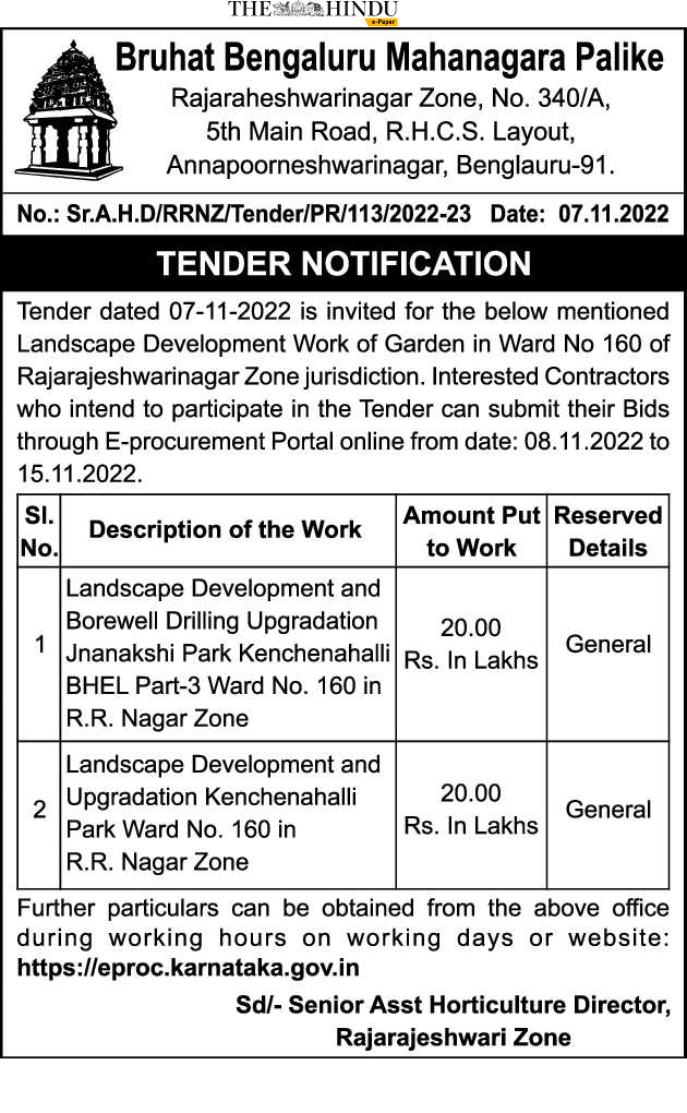 Tender for Landscape Development and Upgradation Kenchenahalli Park Ward No. 160