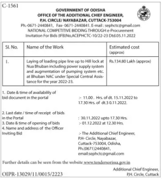 Tender for Laying of loading pipe line up to Hill lock at Nua Bhuban including power supply system and augmentation of pumping system etc. at Bhuban NAC under Special Central Assis tance for the year 2022-23.