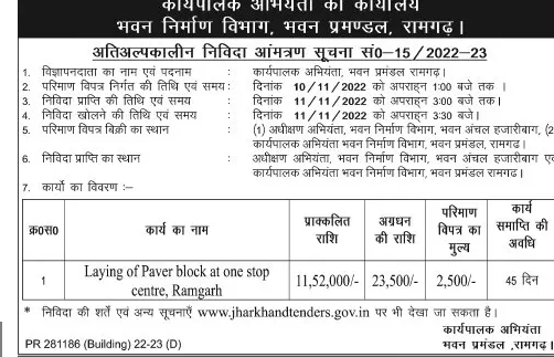 Tender for Laying of Paver block at one stop center, Ramgarh