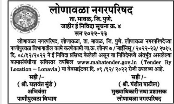 Tender for Lonavla Municipal Council, Lonavla, Maval, Dist. Pune. Go to work in water supply department of Lonavla Municipal Council.No. Lonap 7 / Jainisu / 2022-23