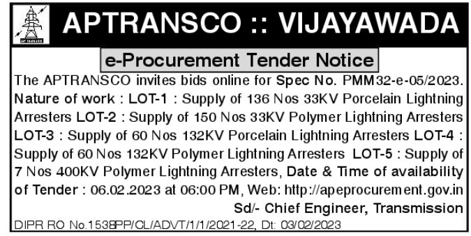 Tender for LOT-2 : Supply of 150 Nos 33KV Polymer Lightning Arresters
