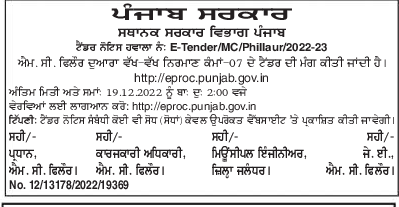 Tender for M. C. Various construction works-07 tenders are invited by Phillaur.