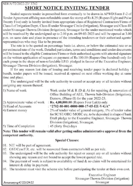 Tender for M & R (D & A) for repairing & renovation of Office Building of AEE, Thowra Sub-Division (Irrigation). Demow, (Phase-II) for the year 2022-23.