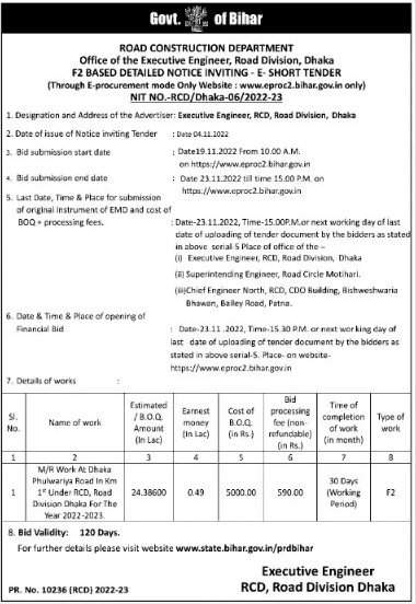 Tender for M/R Work At Dhaka Phulwariya Road In Km 1 Under RCD, Road Division Dhaka For The Year 2022-2023.