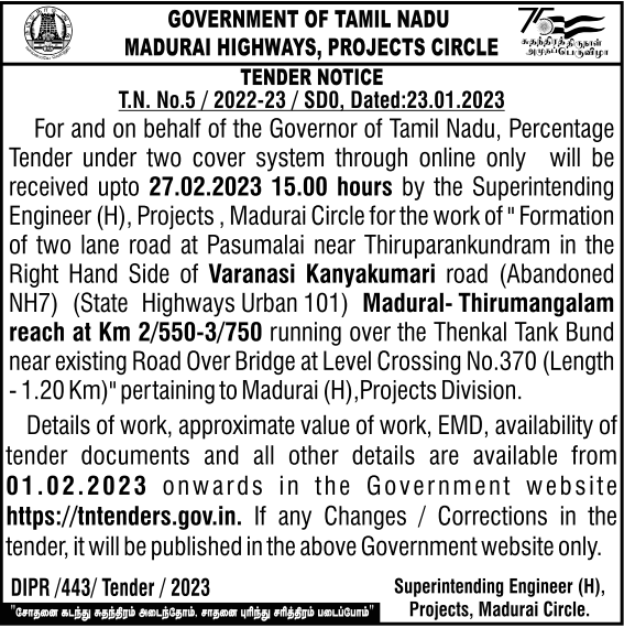 Tender for Madurai Circle for the work of ” Formation of two lane road at Pasumalai near Thiruparankundram in the Right Hand Side of Varanasi Kanyakumari road (Abandoned NH7) (State Highways Urban 101)