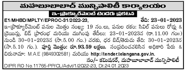 Tender for Mahbubabad Municipality Office E-Procurement Tender Announcement