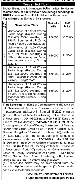 Tender for Maintenance of 14×20 Woven Sacks bags (Raised During 2021-22) 25000 seedlings in BBMP, Yelahanka Zone, Atturu Nursery During 2022-23