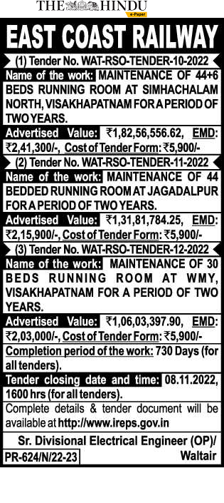 Tender for MAINTENANCE OF 44 BEDDED RUNNING ROOM AT JAGADALPUR FOR A PERIOD OF TWO YEARS.