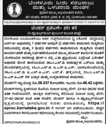 BANGALORE JALMANDALI DOUBLE ENVELOPE FROM ELIGIBLE CONTRACTOR: 20M existing on extended aeration basis of A20 process at Nagasandra Phase-I, Bangalore along with operation and maintenance along with operation and maintenance on turnkey basis for a period of 7 years (2 years at the time of works contract and 5 (five) years after works contract). .LD capacity SP and 15MLD ISPS at Madarahalli, 30MLD ISPS at Bagalgunte. N.K. Designing and Upgrading of 25 MLD ISPSs in the village