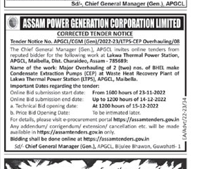 Tender Notice No. APGCL/CGM (Gen)/2022-23/LTPS-CEP Overhauling/08
