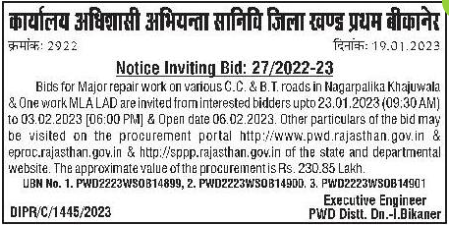 Tender for Major repair work on various C. C. & B. T. roads in Nagarpalika Khajuwala & One work MLA LAD